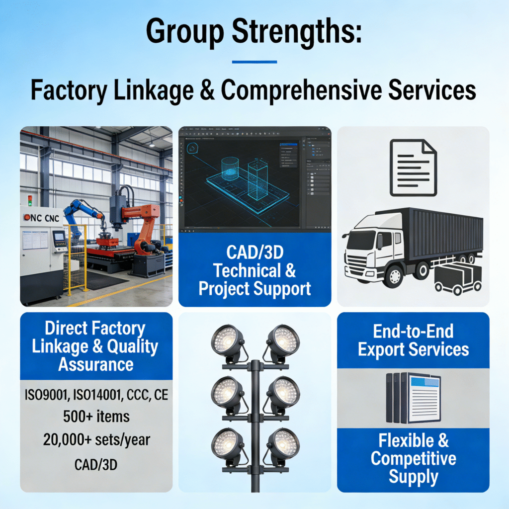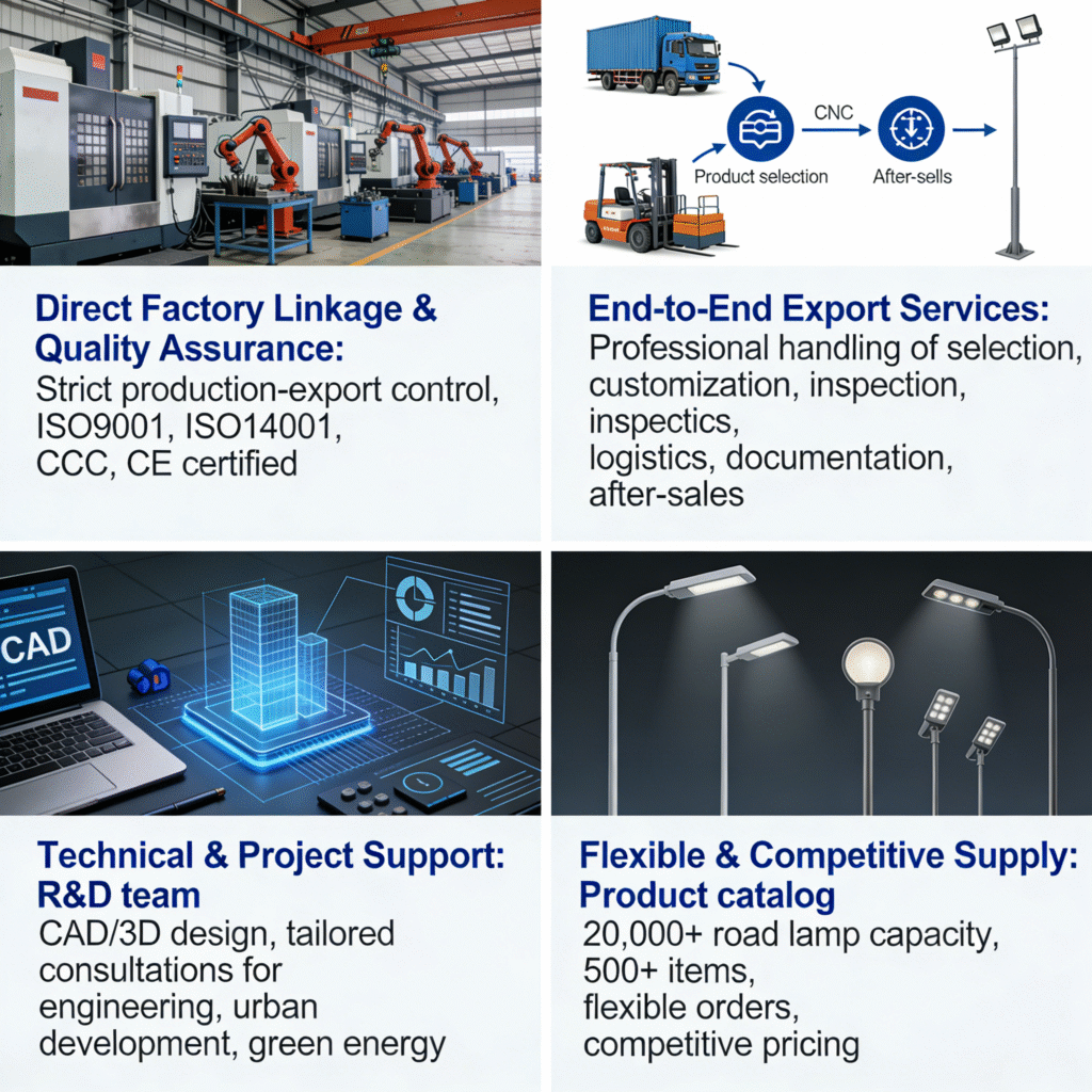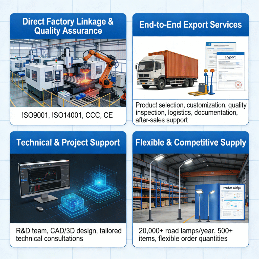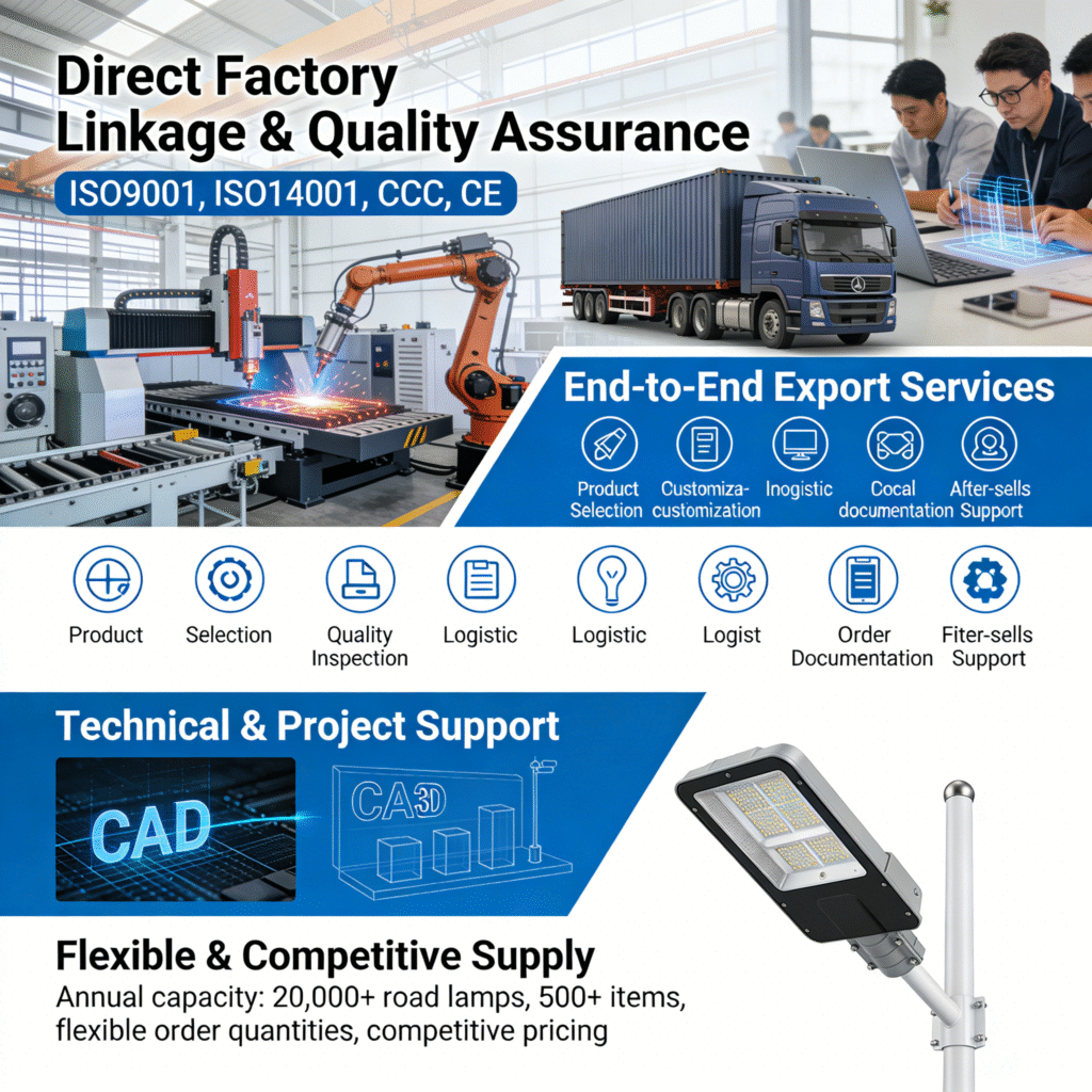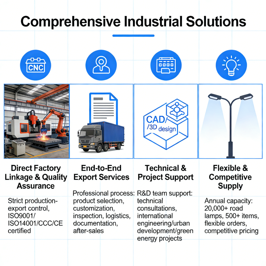 With an annual capacity of over 20,000 sets of road lamps alone and a range of 500+ items, we provide flexible order quantities and competitive pricing to meet diverse market demands.